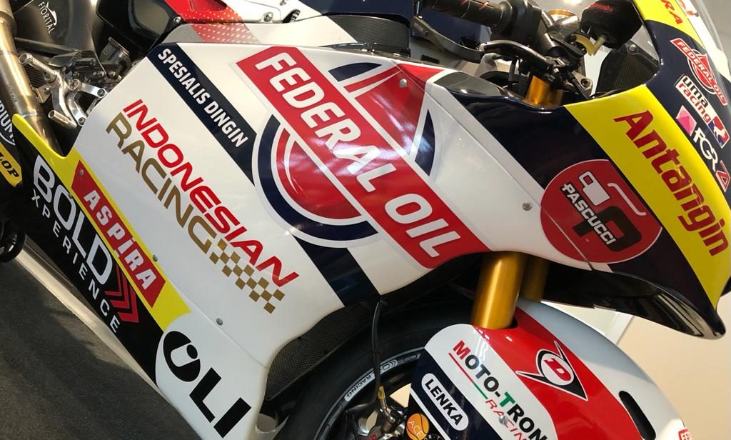 Terdapat tulisan “Indonesia Racing” di bawah logo Federal Oil pada motor dengan kubikasi mesin 765 cc itu.