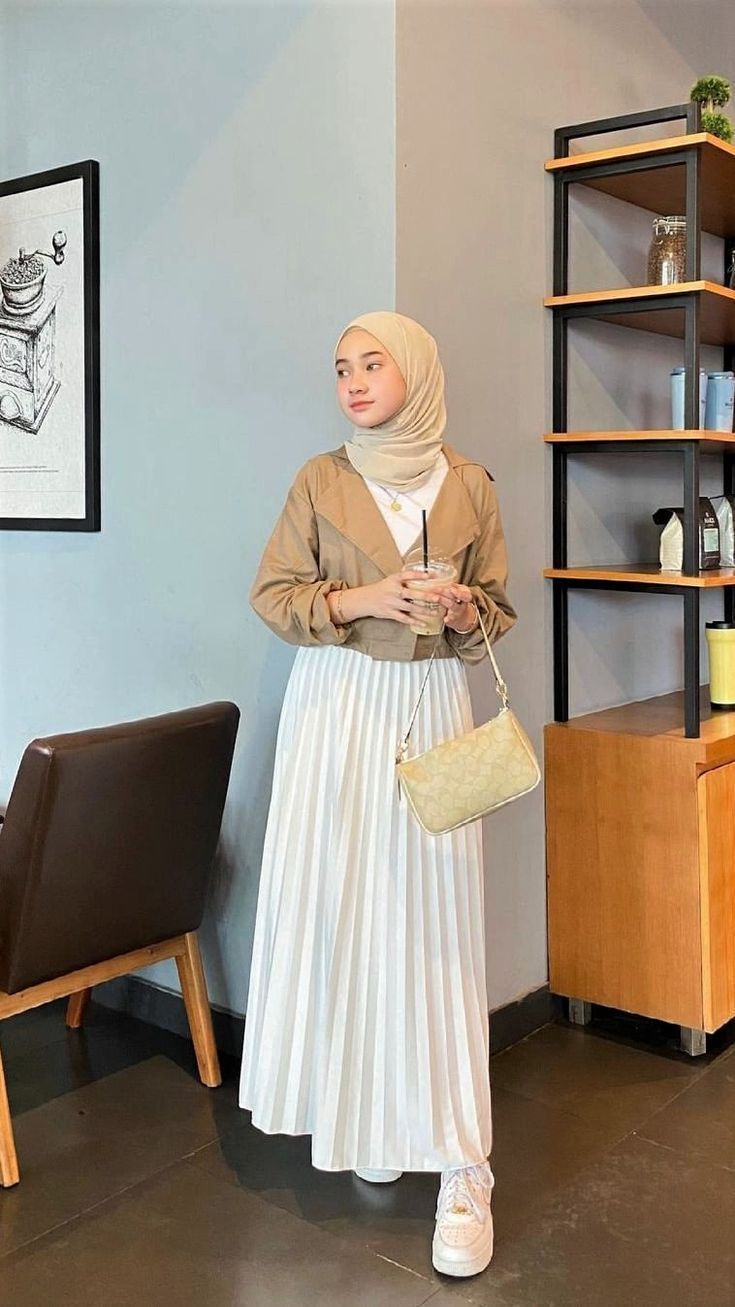 Untuk padu padannya, kamu bisa gunakan blouse putih berlengan panjang yang mengembang dan rok plisket berwarna sama. Jangan lupa pakai hijab dengan warna yang selaras agar penampilanmu semakin memukau. Lengkapi gayamu dengan memakai aksesoris untuk menambahkan warna pada busana yang dikenakan.